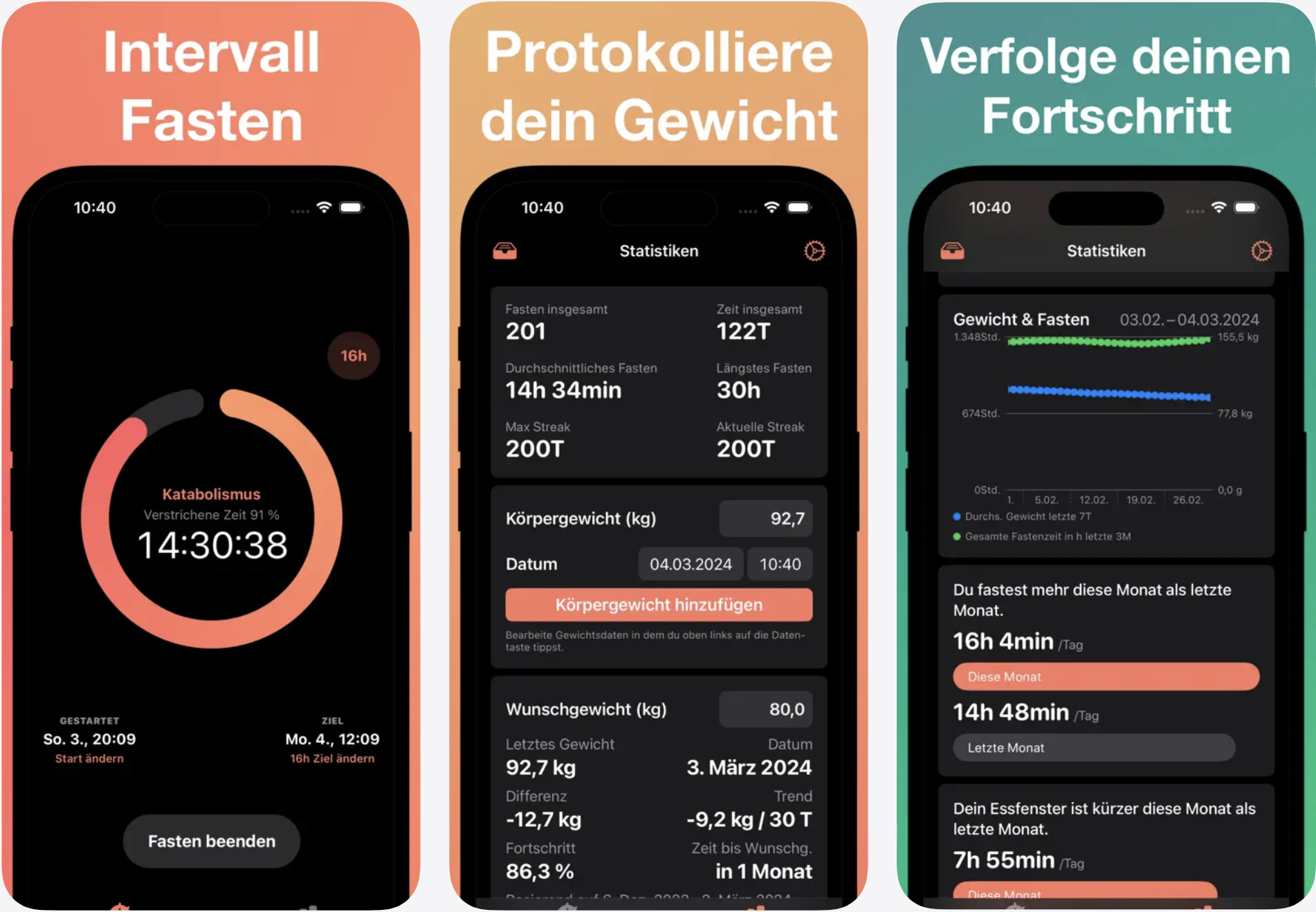 • Hauptmerkmale: Intervallfasten‑Timer, Fastenpläne, Essens‑ und Wasser‑Tracker, Gewichts‑Tracking, Rezepte mit Anpassungsmöglichkeiten, Dashboard zur Fortschrittsübersicht, Tipps und Einblicke zu Fasten‑Vorteilen und Gesundheit, Erinnerungen und Motivation, HealthKit‑Integration für Daten‑Sync (iOS), Anpassung von Ernährung und Allergien